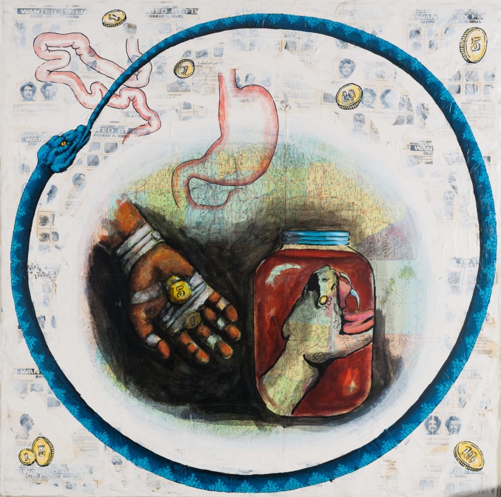 David Wojnarowicz (b. United States, 1964-1992) Hunger, 1988, acrylic and collage on canvas, 42 x 42 in. Gift of Robert H. Halff, 1990.9.