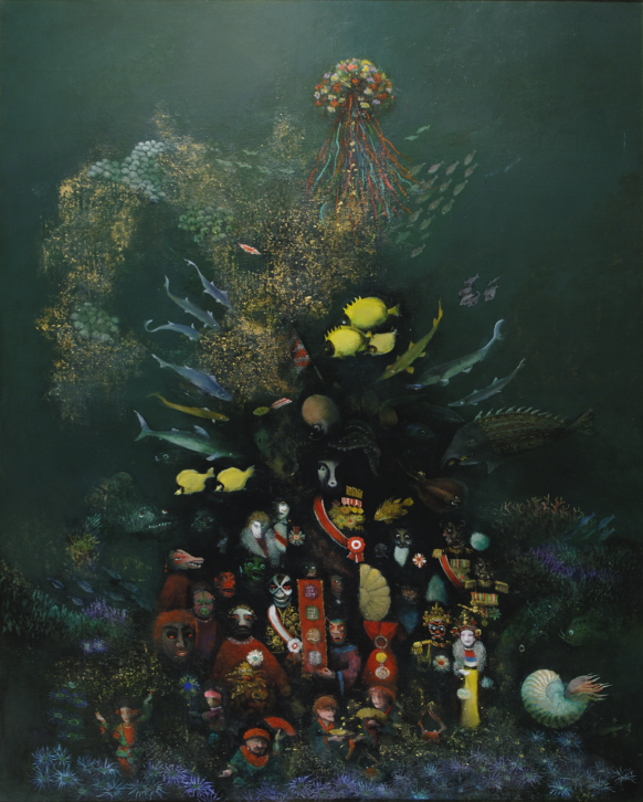 Tomiyama Taeko (b. Japan, 1921-2021), Theatre Beneath the Sea Splendid Banquet for the Empire, 2008, oil on canvas, 65 x 51 2/3 in. Gift of Sakata Natsume in memory of her mother Tomiyama Taeko, 2025.001.004.
