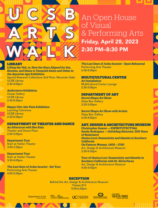 An Open House of Visual & Performing Arts UCSB’s Department of Music, Department of Theater and Dance, Department of Art, College of Creative Studies, Art, Design & Architecture Museum, MultiCultural Center and UCSB Library will host the 6th Annual UCSB Arts Walk. Kicking off at 4:30PM on Wednesday, April 11 students, faculty, staff and community members are invited to visit galleries and studios, watch preview performances, behind the scenes rehearsals, and participate in programming designed to highlight the artistic creativity and talent of the UCSB community. For programs info: https://www.library.ucsb.edu/artswalk