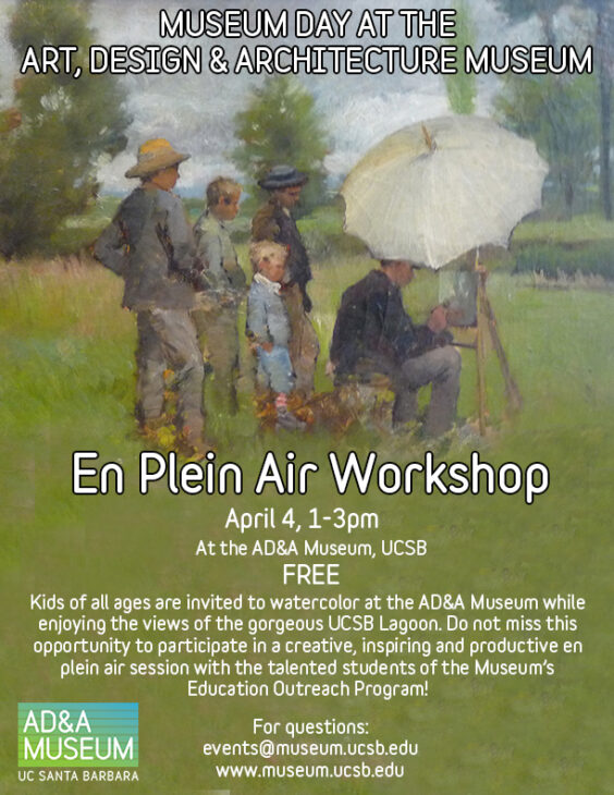 Due to COVID-19 closures, this event has been CANCELLED. Kids of all ages are invited to watercolor at the AD&A Museum while enjoying the views of the gorgeous UCSB Lagoon. Do not miss this opportunity to participate in a creative, inspiring and productive en plein air session with the talented students of the Museum’s Education Outreach Program! Stop by the museum any time between 1-3pm on Saturday, April 4.