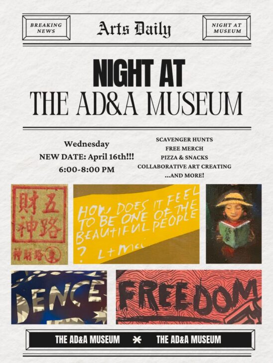 This event will take place on Wednesday, April 16th, from 6-8pm at the AD&A Museum (located near UCen). There will be live music, free food, art-making, museum scavenger hunt, new merchandise, and more. It will be a wonderful opportunity to experience the museum, mingle with friends, and enjoy the exhibitions.