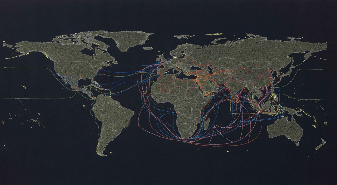 Image credit: Detail of Tiffany Chung, Global Spice Trade: routes from ancient time to the age of exploration/exploitation, 2024–2025, embroidery on fabric, 140 x 380 cm. Courtesy of the artist and Kiang Malingue Gallery, Hong Kong | New York. Photograph by Andrea Rossetti.