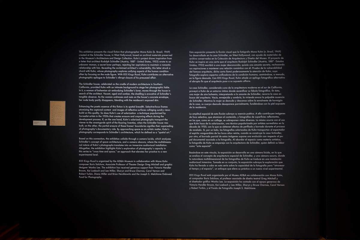 This exhibition tells a story about an unrequited love unfolding on different time and space layers as captured by the sensitive lens of photographer Mona Kuhn. The story's protagonist is a mysterious woman, purportedly a past lover of the architect Rudolph Schindler, who longs for his presence as she sneaks into his vacant and shadowy house. By adopting techniques employed by the surrealists at the time the house was built, Kuhn explores the power of photography to play with one's temporal and spatial senses. Additionally, the photographer emphasizes the fiction's psychic and emotional drive investing the portrait of the house with a phenomenological dimension. Corresponding to the story's elusiveness, the exhibition takes the form of large projections, which, choreographed with original music, underscore the fiction's spatial and temporal qualities. Archival materials from the Schindler collection—the genesis of this innovative audiovisual project—complement the installation.