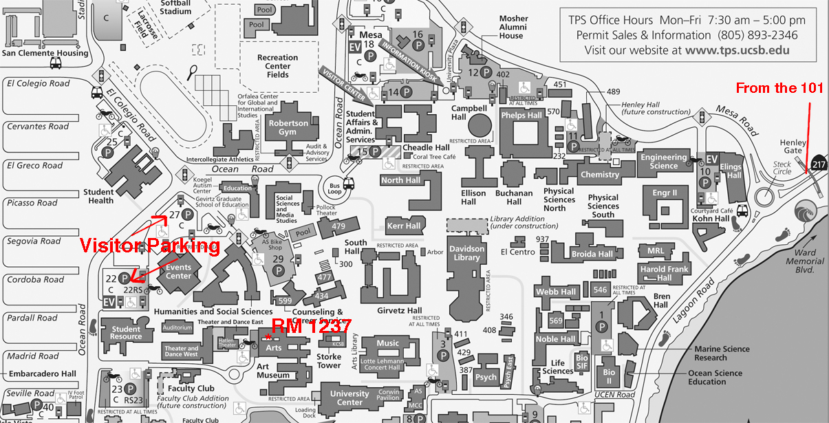 From the highway, merge right onto Mesa Road, make a left on Ocean Road, continue on Ocean Road until El Colegio Road. For Parking Lot # 27, turn left on El Colegio Road; for Parking Lot # 22, continue on Ocean Road then make a left into Lot #22. (See map below).